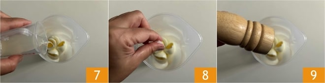 Posteriormente, coloca los huevos en el vaso de una batidora de mano, añade el zumo de limón 7, una pizca de sal 8 y una pizca de pimienta 9.