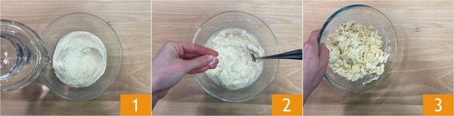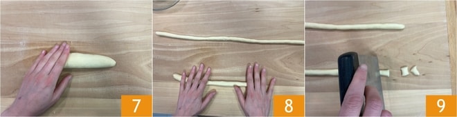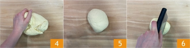 Amasa a mano hasta obtener un panecillo liso 4. Deja reposar la masa durante 15-20 minutos, cubierta con un bol, a temperatura ambiente. Pasado el tiempo de reposo 5, divide el panecillo en pequeños trozos con una rasqueta 6 7.