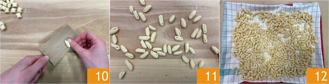 Luego pásalos por la tablilla para ñoquis, manteniendo la parte cortada hacia arriba 10. Continúa de este modo hasta agotar la masa 11. Coloca los malloreddus sobre un paño ligeramente enharinado o sobre la superficie de trabajo enharinada 12.