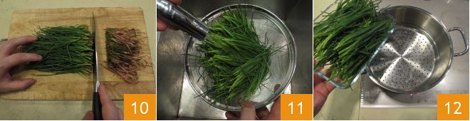 Continúa limpiando la barba de fraile: elimina el extremo final rojizo 10, luego lávala con cuidado bajo abundante agua corriente 11. Cocina la barba de fraile al vapor durante unos 3 minutos 12,