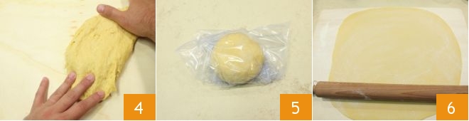 Termina de amasar sobre una superficie de trabajo para obtener una consistencia lisa y homogénea 4; forma una bola y envuélvela con film transparente 5: la masa deberá reposar al menos 30 minutos en un lugar fresco, alejado de corrientes de aire. Transcurrido el tiempo necesario, retoma la pasta al huevo y divídela en dos bolas; mientras estiras la primera, deja la otra envuelta en el film. Estira con el rodillo una lámina de 1-2 mm 6.