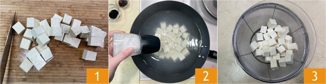 Para realizar el mapo tofu, primero corta el tofu en cubos, teniendo mucho cuidado de no romperlos 1. Escalda los cubos de tofu en agua ligeramente salada durante un minuto 2, luego escúrrelos y resérvalos momentáneamente 3.