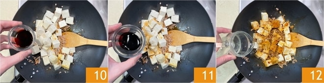 Condimenta con la salsa de soja clara 10 y la salsa de soja oscura 11, luego vierte 3 cucharadas de agua caliente 12.