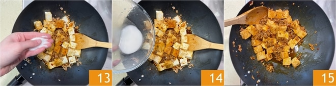 Añade también el azúcar 13 y saltea durante un par de minutos. Mientras tanto, diluye la fécula de patata con una cucharada de agua y viértela en el wok 14. Mezcla bien y apaga el fuego 15.