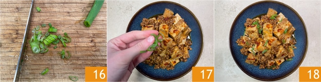 Corta en rodajas la parte verde del cebollino 16 y úsala para decorar el plato 17. ¡Tu mapo tofu está listo para ser disfrutado 18!