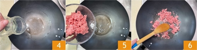 Calienta un poco de aceite de semillas en el wok 4, luego añade la carne picada 5 y sofríe durante unos minutos, mezclando con frecuencia 6.