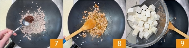 Condimenta con la salsa picante 7 y la pimienta. Mezcla bien para combinar 8, luego añade el tofu 9.
