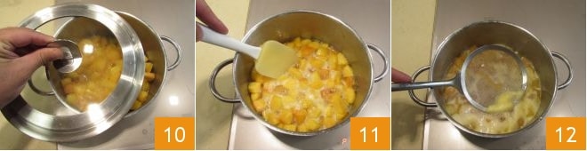 Para preparar la confitura de melocotón comienza eligiendo la fruta: toma melocotones bien maduros y de pulpa firme, lávalos bajo el agua corriente 1, pélalos 2 y quita el hueso 3.