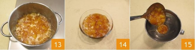 Deja hervir a fuego moderado durante unos 40 minutos 13, hasta alcanzar los 108° (utiliza un termómetro de cocina para medir la temperatura exacta). Mezcla de vez en cuando para que la mezcla no se pegue al fondo de la cacerola. Mientras la confitura se cocina, dedícate a la desinfección de los tarros y las tapas, como se indica en las directrices del Ministerio de Salud que se encuentran al final de la receta. Una vez que hayas realizado esta operación, regresa a tu confitura, que ya estará lista: transfórala a un bol para detener la cocción 14 y transfiérela aún caliente a los tarros que has desinfectado, ayudándote con un cazo y un embudo para confituras 15. Cuida de dejar 1 centímetro desde el borde del tarro.