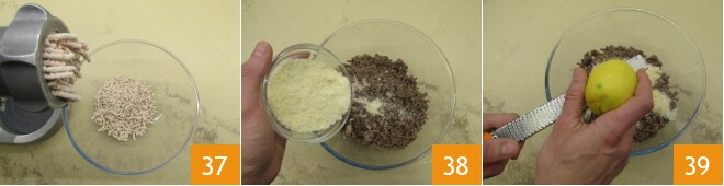 Bien, en este punto tienes todos los componentes para el relleno. Pasa por la picadora de carne el asado de cerdo, los sesos y el estofado 37. Añade las hierbas aromáticas picadas, el Grana Padano DOP rallado 38, sal, pimienta, una ralladura de nuez moscada y la cáscara de limón rallada 39.