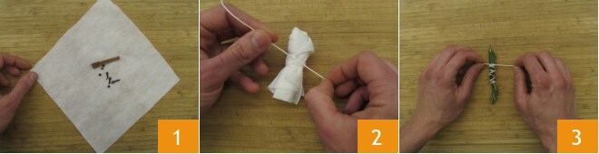 Para preparar los marubini es necesario disponer bien las preparaciones. Comenzamos con el estofado de ternera. Poned en una gasa la canela, los clavos de olor y la pimienta 1, cerrad y atad con hilo de cocina 2. Luego atad también el romero y el laurel 3.