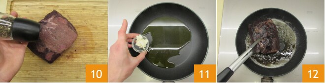 Sala y pimienta la superficie 10 y acércate a la estufa. Calienta en una sartén el aceite y la mantequilla 11, añade la carne y déjala dorar bien por todos los lados, girándola con pinzas o dos cucharas de madera 12.