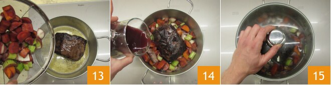 En una cacerola grande transfiere la carne con toda su grasa, añade las verduras con los aromas y deja dorar unos minutos, el tiempo justo para que las verduras se tuesten ligeramente 13. En este punto añade el vino reservado 14, tapa con una tapa y continúa la cocción a fuego lento, debe hervir suavemente, durante aproximadamente dos horas y media; da la vuelta de vez en cuando 15.