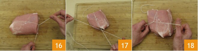 Pasa al asado de cerdo. Lo primero que hay que hacer es atar la carne con hilo, ayudará a mantener la forma durante la cocción. Para hacerlo pasa el hilo de cocina debajo del trozo de carne y fíjalo en un punto 16. Haz un lazo con una mano y con la otra rodea el trozo de carne 17. Coloca todo alrededor del trozo de carne el primer lazo 18