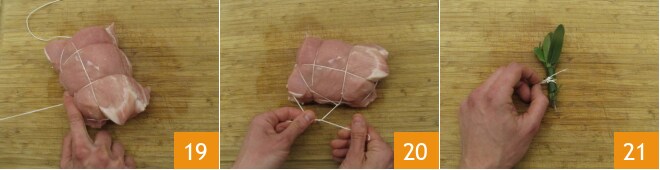 y repite un par de veces el procedimiento 19. Fija un segundo punto en la parte opuesta al primero; sala la superficie de la carne 20. Prepara un ramillete aromático atando juntas las hierbas aromáticas 21.