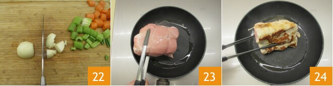 Corta groseramente apio, zanahorias y cebollas limpias 22 y acércate a la estufa. Calienta un hilo de aceite en la sartén y coloca el lomo atado 23. Con la ayuda de pinzas o dos cucharas de madera, dóralo por todos lados hasta que tenga un bonito color 24.