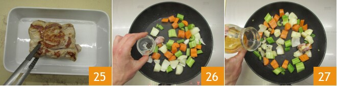 Traslada la carne dorada a una fuente de horno 25 y mientras tanto, en la misma sartén, dora las verduras, añadiendo el diente de ajo sin pelar y los granos de pimienta 26. Deja tostar a fuego alto unos minutos, luego desglasa con el vino y cuando el alcohol se evapore añade el agua, cocinando unos pocos instantes más 27.