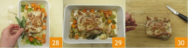 Transfiere todo a la fuente añadiendo el ramillete aromático 28 y cocina en el horno a 175° durante aproximadamente una hora hasta alcanzar una temperatura de alrededor de 70° en el centro 29. Al final de la cocción solo será necesario retirar el hilo de cocina con tijeras o un cuchillo pequeño 30.