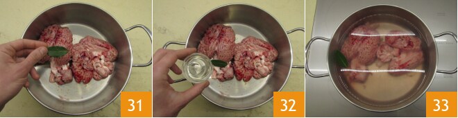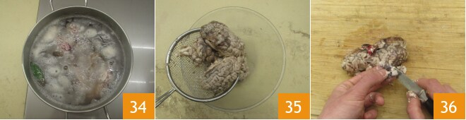 Pon los sesos en una olla, añade el laurel 31 y el vinagre 32, cubre con abundante agua fría 33,