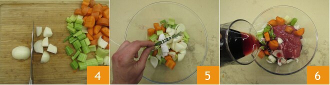 Limpia y corta groseramente las zanahorias, el apio y la cebolla 4, transfiere a un recipiente con los aromas 5 y la carne. Luego añade el vino 6,