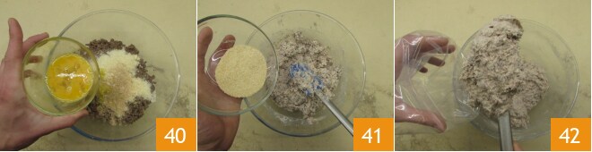 Añade también el huevo 40 y comienza a mezclar con una espátula, luego añade el pan rallado 41 otra mezcla y transfiere la mezcla a una manga pastelera. Deja reposar en el frigorífico durante al menos una hora para que todo se endurezca y se impregne bien 42.