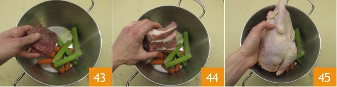 Ahora pasamos a la preparación del caldo. En una olla grande vierte apio, zanahorias y cebolla limpios y cortados en trozos grandes. Añade el músculo de ternera 43, el costillar 44 y la mitad del pollo 45.