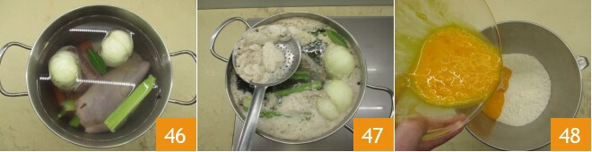Agrega el laurel, las bayas de enebro y los clavos, vierte agua hasta cubrir 46. Cocina durante al menos un par de horas, recordando espumar; al final de la cocción filtra el caldo de la carne y las verduras. 47. Mientras tanto, prepara la pasta al huevo. Si quieres, puedes amasar a mano o, para acelerar, con la batidora. En el bol de una batidora vierte la harina y los huevos 48.