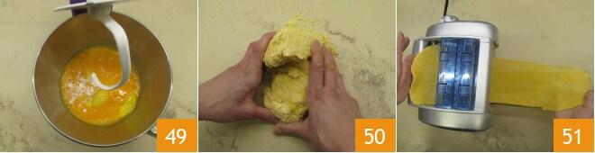 mezcla poniendo en funcionamiento el gancho 49 y cuando los ingredientes estén amalgamados transfiere a la superficie de trabajo, compacta bien obteniendo un bloque que debe reposar en el frigorífico, durante al menos media hora, envuelto en el film 50. Transcurrido el tiempo espolvorea ligeramente el bloque y extiéndelo con la máquina, o con el rodillo, pasando varias veces la pasta hasta que obtengas una hoja fina de aproximadamente 0,5 mm 51.