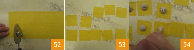 Ayudándote con la rueda dentada 52 obtén cuadrados de aproximadamente 6cmx6cm 53, coloca el relleno en el centro de los cuadrados 54.