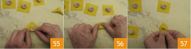 Humedece ligeramente los bordes de la pasta con agua y adhiere bien los dos bordes hacia ti llevándolos hacia la parte opuesta 55. Obtén una especie de triángulo y ciérralo bien con la punta de los dedos; realiza esta operación sobre la mesa de trabajo será más fácil 56. Une los dos extremos obteniendo la típica forma de “ombligo” 57.