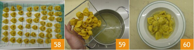 A medida que confeccionas los tortellini colócalos sobre un paño limpio colocado dentro de una bandeja 58. Cuando finalmente el caldo y los tortellini estén listos, asegúrate de que el caldo esté bien de sal, y luego cocina los marubini 59. Después de unos pocos minutos saldrán a flote, sírvelos junto con el caldo y ¡buen provecho! 60.