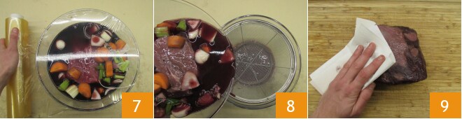 cubre con film transparente y deja marinar durante unas 12 horas en el frigorífico 7. Transcurrido el tiempo de marinado, escurre todo sin tirar el vino, 8 y seca el trozo de carne con papel absorbente 9.