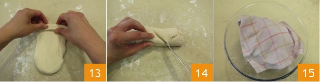 Retome también la otra parte, la que se conservará, enróllela sobre sí misma 13 y haga una incisión en cruz 14. Luego, como se hizo anteriormente, póngala en un bol donde haya colocado un paño y cúbrala 15. Esta también deberá dejarse durante 3 horas a temperatura ambiente, pero luego deberá guardarse en el frigorífico; el fermento no deberá cerrarse herméticamente.