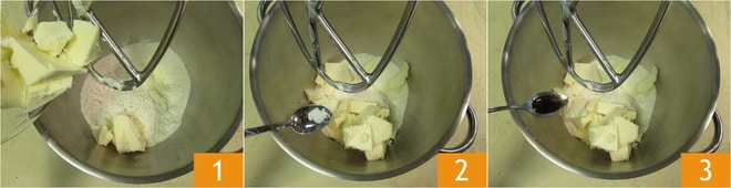 Para preparar la masa quebrada sin huevos, coloca la harina y la mantequilla fría de la nevera en el bol de una batidora equipada con gancho de hoja 2, añade la sal 2 y el extracto de vainilla 3 y mezcla durante 3 minutos.