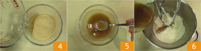 Mientras tanto, vierte el azúcar moreno y el agua a temperatura ambiente en un bol aparte 4 y mezcla bien 5. Añade la mezcla de agua y azúcar a la masa 6 y vuelve a poner en marcha la batidora.