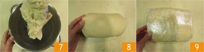 Debes obtener una masa lisa, homogénea y compacta 7. En este punto, transfiere la masa a la superficie de trabajo y forma un bloque 8, cubre con film transparente 9 y deja reposar en el frigorífico durante al menos 30 minutos antes de usarla. ¡Tu masa quebrada sin huevos está lista!