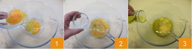 Para preparar la masa quebrada sin mantequilla, primero vierte los huevos enteros y la yema en un bol grande 1 y bate a mano con una varilla, luego añade el agua 2 y el aceite de oliva virgen extra en hilo, sin dejar de mezclar 3.