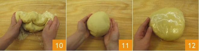 En este punto, transfiere la masa a una superficie de trabajo y continúa trabajando vigorosamente con las manos 10, hasta que obtengas un bloque liso y compacto 11. Después envolviéndolo en film transparente 12 y déjalo reposar en el frigorífico durante aproximadamente una hora. ¡Tu masa quebrada sin mantequilla está lista para ser utilizada para hacer galletas o una tarta!