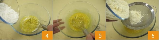 Vierte el azúcar glas en forma de lluvia 4 y mézclalo energéticamente con la varilla 5. En el mismo bol, tamiza la harina 6.