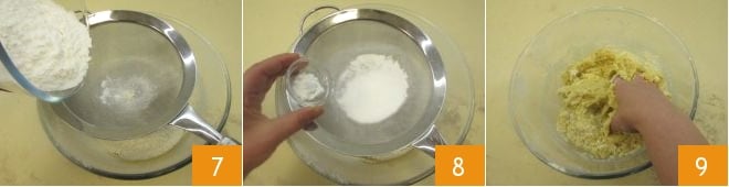 Tamiza también la fécula de patata 7 y la levadura química para dulces 8; amasa a mano para recoger todos los ingredientes 9.