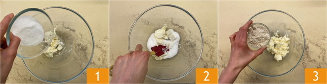 Para preparar la masa quebrada vegana empezad trabajando en un bol la mantequilla vegana y el azúcar 1, ablandadlo bien 2 y luego añadid la harina tipo 1 3.
