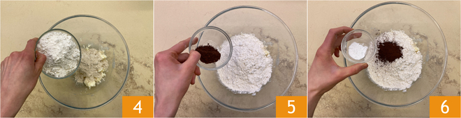 Añadid también la harina de castañas 4, el cacao 5, una pizca de sal y la levadura para repostería 6.