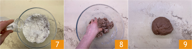 Dad una rápida mezcla y luego verted la bebida de avena 7, amasad a mano hasta que la mezcla cambie de consistencia 8. Trabajad brevemente la masa sobre la superficie y formad un bloque 9, envolvedlo en film transparente, guardadlo en la nevera y tras una hora vuestra masa quebrada vegana estará lista para ser utilizada.
