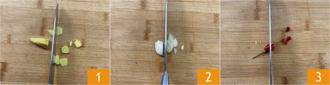 Para preparar el masala de garbanzos, lo primero es preparar los ingredientes: pela el jengibre y córtalo en rodajas 2, luego haz lo mismo con el diente de ajo 2. Pica el chile 3.