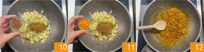 Agrega también el comino 10 y la cúrcuma 11, luego mezcla 12. Deja cocinar durante unos 8 minutos a fuego medio-bajo.