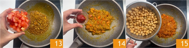 Cuando la cebolla se haya ablandado, añade el tomate 13 y el concentrado de tomate 14. Después de 2-3 minutos, añade los garbanzos, que habrás escurrido y enjuagado previamente 15.