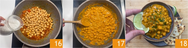 Vierte la leche de coco 16, luego sala y mezcla bien. Cocina durante unos 25 minutos, siempre a fuego medio-suave 17. ¡Sirve tu masala de garbanzos decorado con cilantro y un chorrito de lima 18!