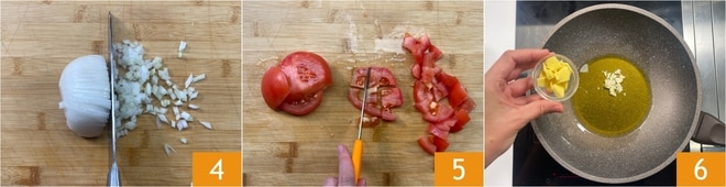 Limpia y pica finamente la cebolla 4, luego corta el tomate en cubos 5. Calienta un poco de aceite en un wok o sartén antiadherente y luego agrega el ajo y el jengibre 6.