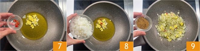 Añade también el chile 7 y la cebolla 8. Después de un instante sazona con el masala 9.