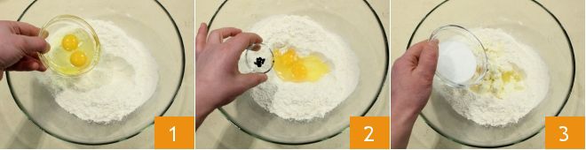 Para preparar las máscaras de Carnaval, comenzad con la masa: en un bol tamizad la harina y añadid los huevos 1, luego verted las semillas de una vaina de vainilla (podéis extraerlas cortando la vaina a lo largo) 2; añadid también la mantequilla en trozos, la pizca de sal y el azúcar 3.